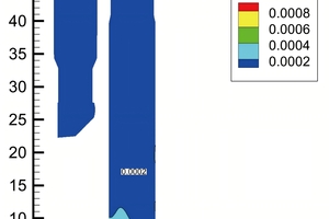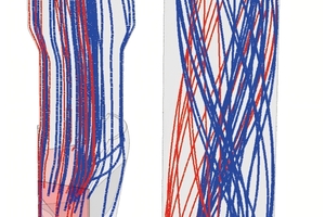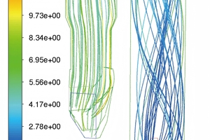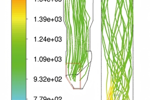 Figure 3 shows the gas streamlines. Figure 4 displays the velocity vector. From Figure 3 and Figure 4 we can see that, when the vertical upward flue gas meets the tangential tertiary air, they interact with each other and rise spirally through the precalciner. The maximum residence time for the tertiary air and the flue gas is 7.65 s and 13.9 s, respectively.