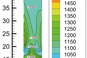 Figure 5 shows the trajectories of coal particles colored by static temperature. Figure 6 shows the temperature contours on the central longitudinal sections. As can be seen from Figure 5 and Figure 6, five streams of coal powder are carried by the gas flow and rotate upwards in the precalciner, rapidly burning near the coal pipes to form five local high-temperature zones.
