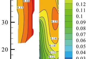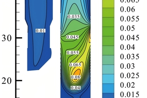 Figure 13 shows the iso-surface with NO molar concentration of 0.0005, Figure 14 shows the Contour map of species concentration on central longitudinal section of CO and NO, and Figure 15 shows the contour map of species concentration at a height of y = 5 m. Combining Figure 13 to Figure 15 to analyze the process of nitrogen oxides reduction in the flue gas entering from the bottom of the precalciner. It can be seen that nitrogen oxides enter the bottom of the precalciner with flue gas, initially with a high concentration. However, when passing through the high CO concentration zone generated by the coal staged combustion located in the cone section, nitrogen oxides are rapidly reduced and the concentration drops sharply. As shown in Figure 15, in areas with high CO concentration, the concentration of NO is relatively low.