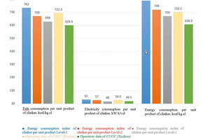 Green and low-carbon technology was applied during the upgrading of the CUCC (Xuzhou) 10000 t/d clinker production line. The comparison of energy consumption data after upgrading with GB 16780-2021 standard data is shown in Table 8 and Figure 5. The fuel consumption was approximately 4% lower than the fuel consumption index per unit product of Level-1 energy efficiency clinker as required in GB 16780-2021 after upgrading. Meanwhile, it has achieved ultra-low NOx emissions through implementation of calciner self-denitrification source emission reduction technology and SNCR technology, saving approximately 43000 t of standard coal per year, reducing CO2 emissions by 108000 t with low-coal consumption technology, and saving 10000 t ammonia consumption with self-denitrification technology.