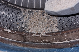 As a result, a final formulation was successfully used in practical trials, with properties corresponding to CAF quality class CAF-F5-C20. The proportion of RTA was 15% in a mixture with natural anhydrite. The processing properties and also the surface texture (Figure 14) corresponded to standard products on the market. Examination of the cross-section of the screed surface revealed good integration of the grain size up to the upper layer, so that no settling occurred. There was also no sintered layer. This proved that it is possible to develop a marketable product based on recycled thermoanhydrite.