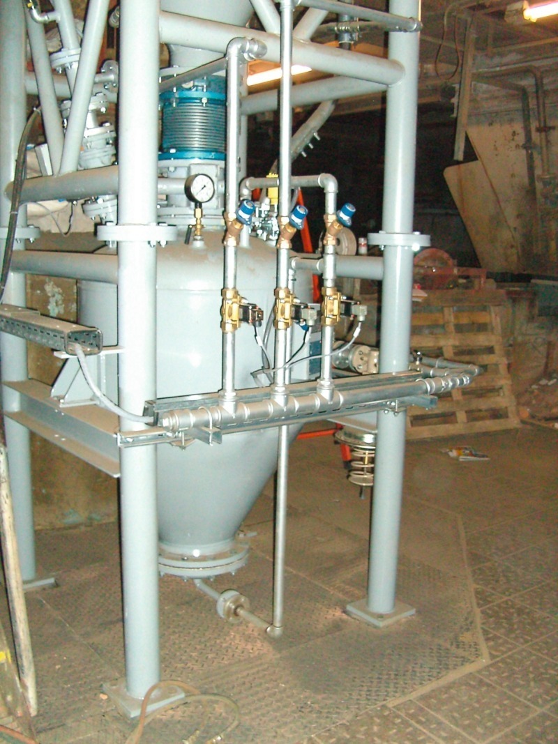 Gericke delivers under the brand name pneuwork® dense phase conveying technology (Fig.) for abrasive or high temperature products. The vessel is equipped with a fluidising bottom, a special wear resistant conical inlet valve. The conveying capacity ranges from some 100 kg/h to 80 t/h. The vessels are in the standard execution manufactured for an operation temperature up to 300 °C and 6 bar conveying pressure.