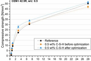 The acceleration of cement hydration through synthetic C-S-H shows great potential in increasing the early strength of cementitious systems. The selection of a suitable calcium-to-silicon ratio and optimized synthesis conditions results in a significant strength gain compared to non-optimized systems. Polymers may contribute during synthesis to stabilizing the C-S-H aggregates, thus enhancing the storage stability of the suspensions.