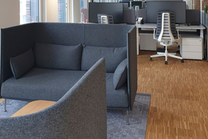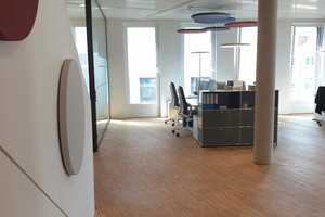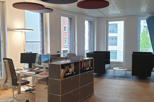 Seating groups allow for brief exchanges with colleagues over coffee. Each floor offers individual retreat possibilities. High, bright rooms with design-oriented interiors define the ensemble, height-adjustable desks and noise-reducing headsets the workplace situation.