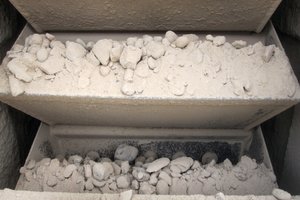 The main task during development of a belt bucket elevator for coarse material is the protection of the belt from damage by the conveyed material. Aumund therefore follows a new path: the narrow, overlapping bucket configuration permits the belt to disappear entirely behind the buckets. It is thus protected and no coarse material can become jammed between the backs of the buckets and the belt. The outer edges of the belt are simultaneously protected. Even in the case of a stoppage with filled buckets, no coarse material will be thrown behind the backs of the buckets (Fig. 1).