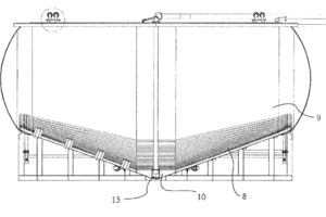(57) The special features of the cement silo for holding cement powder and other powdered materials using compression to transport large amounts with land and marine vehicles are that at the center of the silo body (1) is the cone (2) with decreasing diameter from the upper part of the silo body (1) to the lower part of the silo body (1). Furthermore, the cone (2) functions to contain the cement powder and other powdered materials such that the silo body (1) and the cone (2) are assembled into a part that jointly functions in the filling of cement powder and other powdered materials. The cone (2) has a height that slopes downward to the bottom end of the cone at the bottom of the silo body (1). Pressure is created inside thee cone (2) at the center of the silo body (1) for released pressure to transport cement powder and other powdered materials out of the cone (2) at the center of the silo body (1).