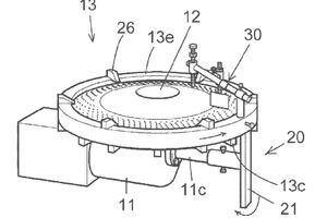 (57) [Problem] To provide a combustion device for a pellet fuel, the device being able to suppress the accumulation or generation of clinker in a grate part and improve a combustion state of solid fuel having a pellet shape or the like. [Solution] The present invention comprises a fuel transport part 11 that transports a solid fuel, a fuel discharge part 12 that opens vertically upward, and a grate part 13 that combusts the solid fuel. The grate part has a conical fixed grate 13d, a rotating grate 13e that is rotatably disposed on an upper part of the peripheral edge of the fixed grate, and a grate rotary vane 20 that rotates the rotating grate. Clinker is sandwiched and pulverized into small pieces by a rotating grate claw 26 formed on the inside of the rotating grate and a fixed 13c grate claw 27 that protrudes upward from the fixed grate, and the small pieces are removed from the outer peripheral edge of the grate part by a clinker removal device that rotates together with the rotating grate.