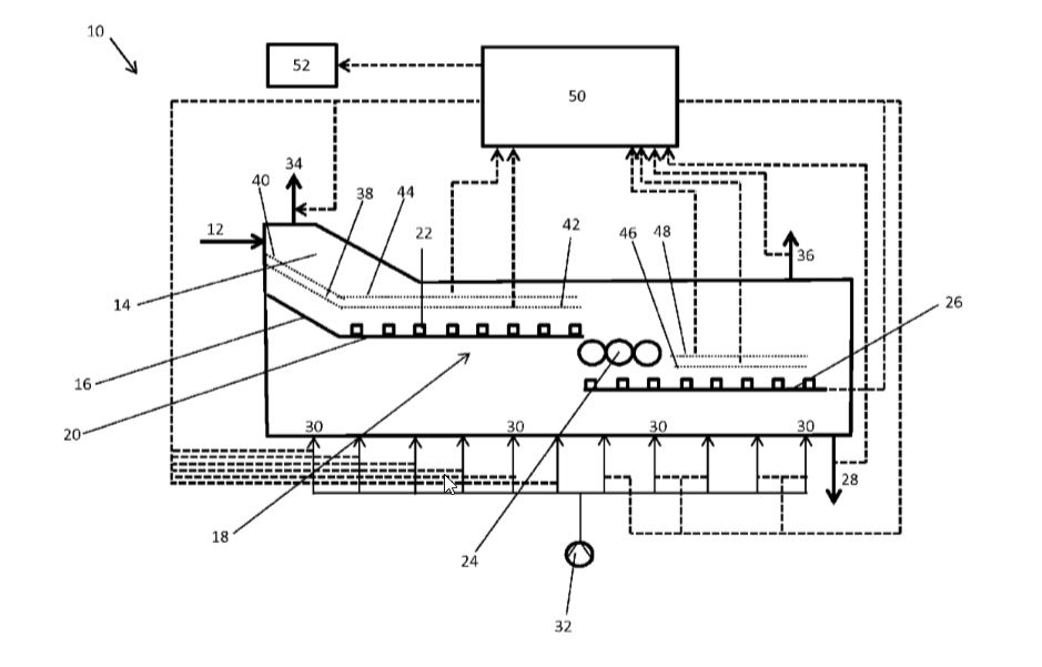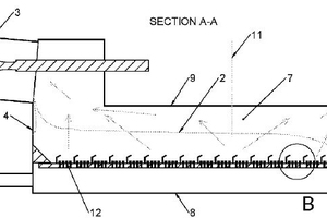 (57) The present invention relates to a cooler for cooling particulate material which has been subjected to heat treatment in an industrial kiln, such as a rotary kiln for manufacturing cement clinker. This cooler comprises an inlet, an outlet, end wall, side walls, a bottom and a ceiling, at least three reciprocating supporting lanes for receiving, supporting and transporting the material to be cooled, the lanes are moving following the walking floor principles as well as means for injecting cooling gas into the material through grate plates in the lanes. The present invention relates to an increasing in the vertical shearing height, and still having stationary clinker on top of the grate plates, see fig. 5. The length of the tilted element (16) is L and the distance (13) between two devices is G. The angle between the element (16) and horizontal is alfa (18). Since the air is distributed evenly from the full grate plate area it is obvious and understandable that the L*cosines(alfa) becomes a shadow area where all air from the region in the grate plate will go through the stationary clinker and leave the tip of L at this one point only. Again, it is not good for the heat recuperation to have a shadow area too big – as it, again, gives an uneven air flow through the clinker bed, damaging the heat recuperation. The vertical shearing height is on the other hand L*sinus(alfa). But if alfa becomes too large (approximately above 60 deg.), it will block the sliding effect, as now the clinker will not get forced over the plate’s L-part, and then the wished larger vertical shearing is not achieved. It is hereby a compromise to get a certain vertical shearing: L*sinus(alfa) by not having a too large shadow area L*cosines(alfa), but still having the angle alfa so low that the clinker will slide at L – see fig. 5.