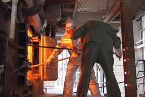 Control and monitoring of the burning process takes place from the control centre. Beginning or existing blockages in the preheater can be identified by the plant operator on the basis of three parameters, which are continuously recorded via sensor devices installed in the entire preheater: Temperature increase, reduction in cross section at the outlet openings of the respective cyclones or pressure increase or reduction of the negative pressure in the system. In most cases, detached lumps of incrustation lead to the formation of material bridges in the outlet of a cyclone, and the subsequent flow of raw meal builds up on these bridges. Based on the position of the sensors, the operator is able to locate the blockage. After the material feed to the process has been stopped and the pendulum flaps in the discharge chute have been opened, the preheater attendant begins to remove the blockage. To do this, he opens the existing rodding ports above the material blockage and breaks up the reachable lumps of incrustation and material with long rods, compressed air tools, air lances or similar devices.