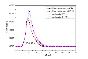 Pulverized coal combustion was investigated for bituminous coal and anthracite at different temperatures (973K and 1173K) in a horizontal fixed-bed reactor test system using computational fluid dynamics (CFD) software. The high temperature sufficed to promote NOx formation. For coals of identical mass, much more NOx formed during anthracite combustion than was the case for bituminous coal, but the maximum NOx concentration for bituminous-coal combustion was higher. Two experimental results are mutually complementary, providing important theoretical guidance for exploring the gaseous products of pulverized-coal combustion. Choosing anthracite as fuel and locating the coal inlets in the low-temperature zone could reduce the level of NOx emissions in the cement industry.