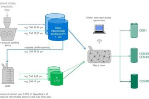 Because of growing challenges in comminution technology with respect to rising product finenesses, controllable particle size distributions and higher energy efficiency, the current trend of research work is towards proportionate ultra-fine grinding of the cement main constituents using stirred media mills (SMMs). The “separate ultra-fine grinding” process utilizes high energy efficient pre-comminution stages, such as high-pressure comminution devices (1st grinding stage), in which several different intermediate products are pre-ground to different finenesses. A small proportion of the finest intermediate product from the 1st grinding stage is then ground separately to very high finenesses by SMMs (2nd grinding stage), so that – at the end – there is a pool of different intermediate products with varying finenesses for mixing cements (Figure 1) [1, 2, 3].