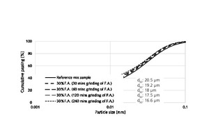 Thermal power plants have a significant role in energy production. Within the combustion process, a by-product called fly ash is obtained and can be utilized by the cement industry as an additive for improving the overall economy of the manufacturing process. This study focuses on evaluating the performance of a fly ash classification plant with regard to quality development in the streams of material through the classifier. Within that scope, the cementitious properties of raw, fine and coarse ash were determined in dependence on changes in their degree of fineness. The values of fineness were adjusted both by changing the operating conditions of the classifier and by way of laboratory-scale grinding tests in which inter-grinding of cement and fly ash was taken into consideration. The study showed that the streams of material through the classifier had similar quality results, and that inter-grinding could increase the ash content by up to 45 % with 14 % improvement in strength. Moreover, it proved possible to nullify the negative effect of fly ash addition on early-age strength of fly ash cement mixture by means of inter-grinding.