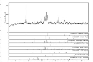 X-ray diffraction analysis showed that the diffraction pattern of steel slag was very complex with several overlapping peaks, with portlandite [Ca(OH)2] as the most abundant mineral phase and hematite [Fe2O3], larnite [Ca2SiO4], wusite [FeO], calcite [CaCO3], lime [CaO] and sanidine [K(Si3Al)O8] as major and minor mineral constituents (Figures 1a and 1b). Diffraction peaks corresponding to free CaO in steel slag LD-2 was found to be more prominent than in steel slag LD-1. The presence of free lime is an indication of the potential for volumetric instability and expansive hydration reaction [17] whereas calcium silicate is an indication of the cementitious properties of the steel slag.