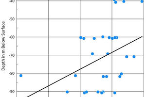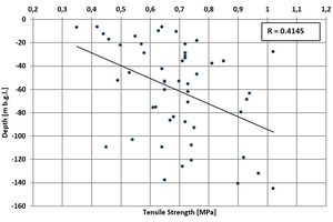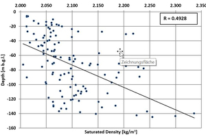 At Lägerdorf there was a correlation between increasing cohesion and friction angle and increasing depth. Such a correlation could not be established for Obourg due to lack of available tests.