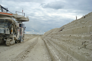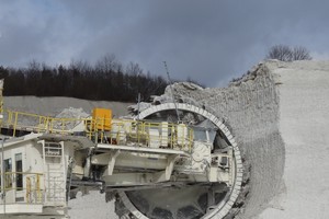 At Volsk, the operation is mining in dry conditions and the full final slope height of 85 m of chalk is exposed. Until recently, this deposit was mined by conventional drilling and blasting of 13 m benches and during the dry summer months also complemented with a surface miner (Figure 10). Since 2019, drilling and blasting has been limited to only a hard layer at the lower contact to the underlying clay, and the rest is mined directly by backhoe excavators.