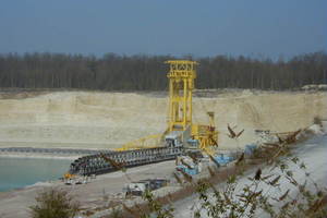 The deposit at Obourg is close to a major public canal which presents a major shipping lane. The operators decided not to drain the pit and work in dry conditions, but to extract the majority of the material below groundwater level by means of a dredging operation with a bucket chain excavator (Figure 8). The excavator can reach down to a maximum of 50 m below ground and extract the chalk at an even overall slope angle of 46°. The minor part of the deposit above the groundwater level is mined directly by backhoe excavators. No slope failures were reported, however, since most of the slope is submerged, slope failures would not be obvious. Today the slope design is not geotechnically optimised for maximum chalk recovery but is merely a result of the mining method and constraints. [9] assessed the possibility to steepen the slope angle and to optimise the chalk recovery and determined that overall slope angles of 65-70° are possible.