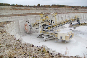 The final slope design for the current mining area Neue Heidestrasse foresees eight benches in chalk of 11 m height each, resulting in an overall final slope height of 88 m and an overall slope angle of 60°. The extraction equipment is a bucket-wheel excavator (BWE) (Figure 9).