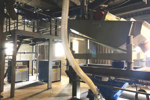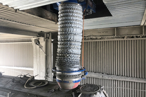 Due to a new 8-section aeration, the silo cone modification enables an optimal discharge behavior of the bulk material. Two delta-blowers aerate once the inner, and once the outer fluidization ring. The sections are separated by pneumatic butterfly valves. The bulk material passes in a defined amount through a flow-control gate to airslides. A flow control gate regulates the material flow onto a vibrating screen. Coarse material is separated and discharged. The fine material falls from the vibrating screen on a mobile loader with a moving range of 1m. A mobile loader is connected to the loading spout. The dedusting of the mobile loader is realized via a bag filter. The filter discharge is controlled by a Kreisel rotary valve, which leads the material to a separate airslide system, which also throws off onto the vibrating screen. Thus ensuring a closed and dust-free system.