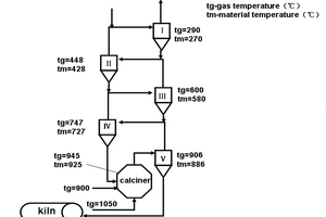 A precalcining kiln is a series of equipment items for producing cement clinkers. The raw material for cement production is a mixture of predetermined proportions of limestone, silica and small quantities of alumina and iron oxide. The raw material passes sequentially through a preheater, a calciner, a kiln and a cooler to produce cement clinkers. In the preheater section, the raw material is preheated to calcination temperature via heat exchange with hot gases from the calciner. In the calciner, most of the raw material is calcined. The energy required for an endothermic...