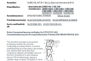 (57) Summary of the corresponding patent WO2017001638 (A1): The invention provides a process for producing cement, the process comprising providing heat to a cement manufacturing process using a secondary fuel, wherein the secondary fuel comprises cellulose and plastic and is in the form of pellets of a size between about 3-25 mm thickness, having a calorific value of about 16 GJ/ton or more, and wherein said secondary fuel is supplied at a place between the kiln inlet and the first cyclone, wherein after formation of the cement clinker, the cement clinker is cooled and milled to cement powder. Preferably, the secondary fuel is supplied to the riser pipe or to a pre-kiln combustion chamber. Generally, the secondary fuel is provided at a place which allows the pellets to burn before coming in contact with the cement materials in the kiln, while it also does not rise into the cyclone, thereby preventing blocking of the cyclones.
