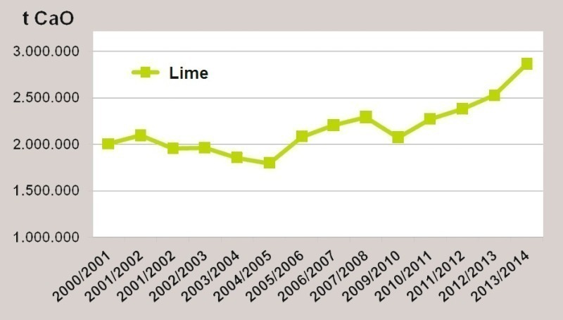 New statistics for the sales of lime fertiliser in the business year 2013/2014 (01.07.2013 – 30.06.2014) show the increased application of agricultural limes in German agriculture. The sales volume of 2 865 000 t of CaO means that approx. 13 % more lime was used by the farming and forestry sectors than in the preceding business year 2012/2013, and even 32 % more than the average figure for the last 14 years (Fig. 2).