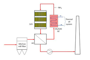 In this system an oil-to-gas heat exchanger is installed before the SCR (fed with thermal oil coming from the WHR system); the dedusted exhaust gases from SCR pass though a gas-to-gas heat exchanger and are then released into the atmosphere.