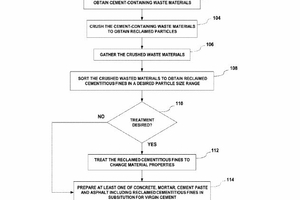 (57) An environmentally-friendly substitute for virgin dry cement is provided. The substitute is obtained as reclaimed cementitious fines produced by recycling cement-containing waste materials, such as recycled concrete aggregate and demolished brick structures. The reclaimed cementitious fines are used as cementitious material in new concrete, mortar, cement paste and other cement-containing materials and structures. A recycling method involves obtaining cement-containing waste material, crushing the cement-containing waste material, gathering the crushed cement-containing waste materials, the crushed cement-containing waste materials comprising reclaimed particles derived from said cement-containing waste material; and sorting the crushed cement-containing waste materials by particle size to obtain reclaimed cementitious fines having sizes in a desired particle size range, e.g., 0.1 micron to 200 micron for use as a substitute for virgin dry cement powder. Notably, the crushing/tumbling methodologies used to obtain the reclaimed particles produce significantly less carbon dioxide that the methodologies used to obtain virgin dry cement.
