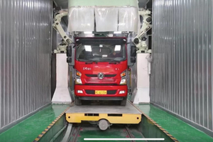 An automatic bag loading machine registers, scans and models the truck’s size, and automatically loads the trucks according to its calculated capacity. Two robots coordinate and alternately grab the waiting cement bags from the pallet at the end of the conveyor belt, and stack the truck according to its set model.