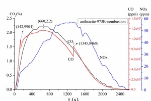 Pulverized coal combustion was investigated for bituminous coal and anthracite at different temperatures (973K and 1173K) in a horizontal fixed-bed reactor test system using computational fluid dynamics (CFD) software. The high temperature sufficed to promote NOx formation. For coals of identical mass, much more NOx formed during anthracite combustion than was the case for bituminous coal, but the maximum NOx concentration for bituminous-coal combustion was higher. Two experimental results are mutually complementary, providing important theoretical guidance for exploring the gaseous products of pulverized-coal combustion. Choosing anthracite as fuel and locating the coal inlets in the low-temperature zone could reduce the level of NOx emissions in the cement industry.