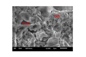 The morphology of 3-day hydrated control cement paste showed the development of porous calcium silicate hydrates (C-S-H) gel around the cement grains with the formation of ettringite and portlandite (CH) (Figure 8a). The hydrated cement matrix was observed to be denser as the hydration proceeds (Figure 9a). Abundant larger crystals of portlandite up to 35 µm were detected in the 28-day hydrated cement paste (Figure 10a). The morphology of the hydrated cement paste (PSC-A-55) showed the presence of relatively coarser slag particles when compared with the hydrated control paste due to the presence of coarse slag particles of sizes up to 100 μm with high interstitial porosity. The formation of small crystals (3 μm) of ettringite was observed in the interstitial pores along with formation of portlandite and C-S-H gel around the cement grains (Figure 8b). Most of the slag particles were unreacted and the interface between slag particles and C-S-H gel was not filled with any hydrated products. The density of the interstitial pores was significantly reduced as the hydration proceeded. Ettringite crystals up to a size of 6 μm were detected in the pores, air voids and interfacial zones (Figure 9b). A denser microstructure was observed in cement paste hydrated for 28 days. Ettringite crystals were detected in the pores and voids and portlandite crystals were present in abundance (Figure 10c). The morphology of the cement pastes showed a denser hydrated cement matrix in the hydrated control cement paste at all ages when compared with the hydrated steel slag cement paste. This was due to the formation of more porous interfacial zones between the unreacted slag particles and the C-S-H gel, resulting in a marginal reduction in strength.