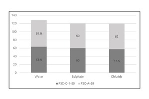 Investigations into the effect of curing under aggressive environmental conditions (such as sulfate and chloride solutions) of slag cement blends PSC-A-45 (Figure 11a) and PSC-A-55 (Figure 11b) and their control counterparts PSC-C-1-45 and PSC-C-1-55 were carried out by determining the compressive strength of cement mortar cubes (cement: sand=1:3) immersed in sulfate and chloride solutions for 6 months. The compressive strength of mortar cubes immersed in plain water was also measured for reference. The results of the strength development of cement mortar cubes cured in sulfate and chloride solutions were found to be comparable to those of mortar cubes cured in plain water, showing that slag cements prepared using a combination of granulated BF slag and steel slag were resistant to sulfate and chloride solutions as shown in Figures 11a and 11b. Dhir et al. [24] and Maes [25] investigated the effects of chlorides and sulfates on the durability characteristics of concrete.