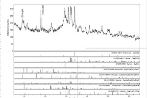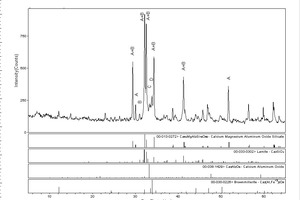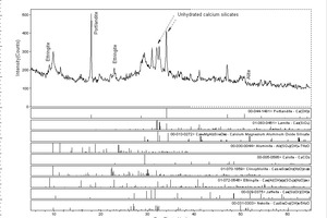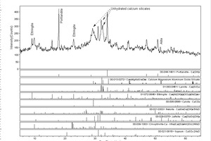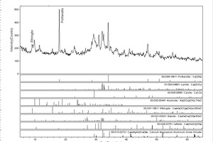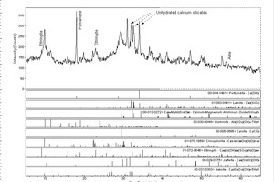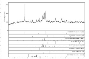 X-ray diffraction analysis showed that the diffraction pattern of steel slag was very complex with several overlapping peaks, with portlandite [Ca(OH)2] as the most abundant mineral phase and hematite [Fe2O3], larnite [Ca2SiO4], wusite [FeO], calcite [CaCO3], lime [CaO] and sanidine [K(Si3Al)O8] as major and minor mineral constituents (Figures 1a and 1b). Diffraction peaks corresponding to free CaO in steel slag LD-2 was found to be more prominent than in steel slag LD-1. The presence of free lime is an indication of the potential for volumetric instability and expansive hydration reaction [17] whereas calcium silicate is an indication of the cementitious properties of the steel slag.