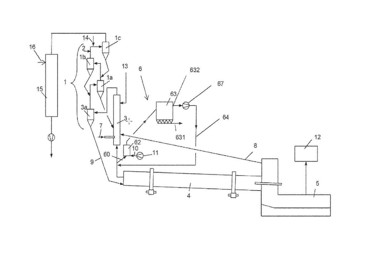 (57) Summary of the corresponding patent EP2881377 (A1): In bekannten Verfahren zur Herstellung von Zementklinker wird ein CaCo3-haltiges Rohmehl in einem Kalzinator entsäuert und anschließend in einem Drehrohrofen zu Klinker gebrannt. Dabei wird an einem Brenner im Kalzinator ein üblicherweise niederkalorischer Brennstoff mit Tertiärluft verbrannt. Dabei entsteht in erheblichem Umfang Kohlenmonoxid, das nur teilweise mit Stickoxiden zur Reaktion gebracht werden kann und in einem nicht unerheblichen Umfang in die Umgebung abgegeben wird. Zur Reduzierung des Kohlenmonoxidgehalts im Abgas des Kalzinators wird erfindungsgemäß vorgeschlagen, dass dem Kalzinator im Bereich des Brenners zusätzlich zur Tertiärluft reiner Sauerstoff zugeführt wird. Dadurch wird das Anbrennen des Brennstoffs Kalzinatorbrenner beschleunigt und die Bildung von Kohlenmonoxid unterdrückt und bereits entstandenes Kohlenmonoxid wird zumindest teilweise nachverbrannt.