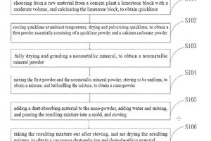 (57) A method for producing a dust-reducing and dust-absorbing material from a nonmetallic mineral and a raw material from a cement plant. The method includes calcining the limestone block, to obtain quicklime; cooling the quicklime at ambient temperature, drying and pulverizing the quicklime, to obtain a first powder essentially consisting of a quicklime powder and a calcium carbonate powder; fully drying and grinding a nonmetallic mineral, to obtain a nonmetallic mineral powder; mixing the first powder and the nonmetallic mineral powder, stirring to be uniform, to obtain a mixture, and ball milling the mixture, to obtain a nano-powder; adding a dust-absorbing material to the nano-powder, adding water and mixing, and pouring the resulting mixture into a mold, and stoving; and air drying the resulting mixture, to obtain a cavernous dust-reducing and dust-absorbing material.
