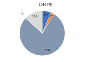 Coal-fired power plants currently still constitute the most important source of energy for the generation of electricity in many countries in the world. In countries like China, India and in various countries in Southeast Asia, more coal-fired power plants are being built. According to the International Energy Agency (IEA), depending on the CO2 scenario, the global power plant output will rise from 7484 GW in 2019 to between 13400 and 16550 GW by the year 2040. FGD plants are also currently being upgraded in countries like India, Australia and South Africa (Figure 8), which have so far not used the technology. Therefore, this forecast expects that worldwide FGD gypsum quantities will only decrease insignificantly from 176 Mt/a in 2019 to 173 Mt/a in 2030. Figure 9 shows what share the countries and regions will have in this time period. Losses in North America and Europe contrast with gains in China and the rest of the world (ROW).