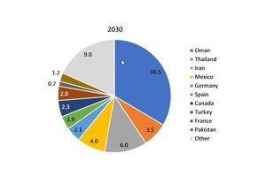 Figure 3 shows the forecast curve for global production of natural gypsum up to 2030. In 2020, on account of the pandemic, the quantities produced fell by -3.8% to 166.5 Mt/a. For 2021, a slight recovery by 1.3% to 168.7 Mt/a resulted. In contrast, over the years 2025 to 2030, only a smaller further increase in production quantities is expected. The major production countries for natural gypsum are shown in Figure 4. China leads the field, with a global market share of 20.4%, followed by the USA and Iran. The TOP 10 countries make up a market share of around 75%. Some of the previously important countries, such as Thailand and South Africa, will continue to lose ground as the resources available there have already been largely exhausted. The winners include countries like Oman and Iran, which still hold extensive reserves (Figure 5).